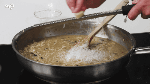 When the rice is almost ready, add the remaining butter and parmesan (leave some for serving) and mix well.