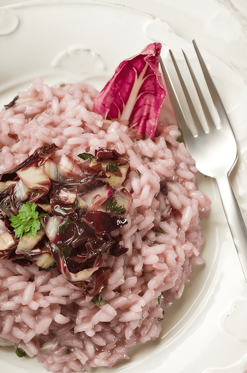 Heat olive oil in a deep skillet over medium heat, add finely chopped shallot and sauté for 3 minutes until golden. Then add thinly sliced radicchio and cook for 2 minutes. Add rice and stir for 1 minute.