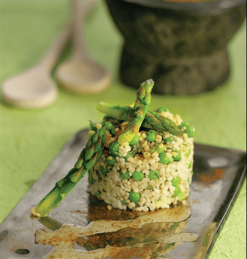 Bulgur risotto with asparagus, green peas and graviera cheese