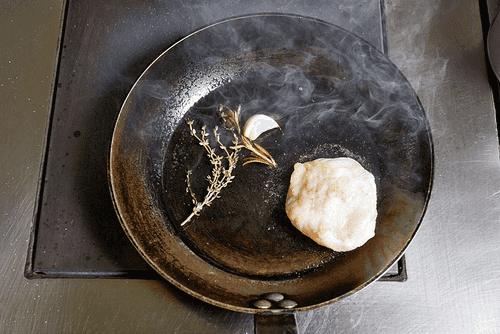 Salt and pepper the monkfish fillet and let it sit for a while. Pour a little olive oil into the pan, add a sprig of thyme, rosemary, and a clove of garlic. Sear the fish with the herbs for a minute on each side until the fillet turns white. Now you can set the fish aside and focus on the risotto.