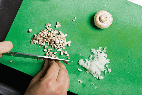 Mushrooms are the main aromatic component of risotto. First, they need to be finely chopped, and do the same with the onion. Heat olive oil in a saucepan, sauté the mushrooms for a couple of minutes, then add half of the onion, salt, pepper, and cream for color. Stir, cook for another two minutes, then transfer to a plate and set aside.