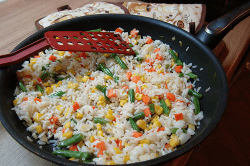 We add rice, canned corn, and pepper to the pan with onion and carrot, and mix everything thoroughly.