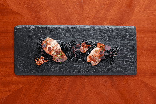 This exquisite recipe combines the ocean freshness of squid with the rich flavor of creamy lentil risotto, enhanced by squid ink and the aroma of thyme. The light smokiness of black powder from roasted leeks adds depth and elegance to the dish. Italian cuisine is renowned for its ability to transform simple ingredients into a gastronomic masterpiece, and this recipe is no exception. It is perfect for a special dinner where you want to impress guests with a unique combination of textures and aromas. Tender squids, fried to a golden crust, harmoniously pair with the rich risotto, creating an ideal balance of taste and aesthetics. Serving it with red shiso salad adds freshness, making the dish even more expressive and unforgettable.