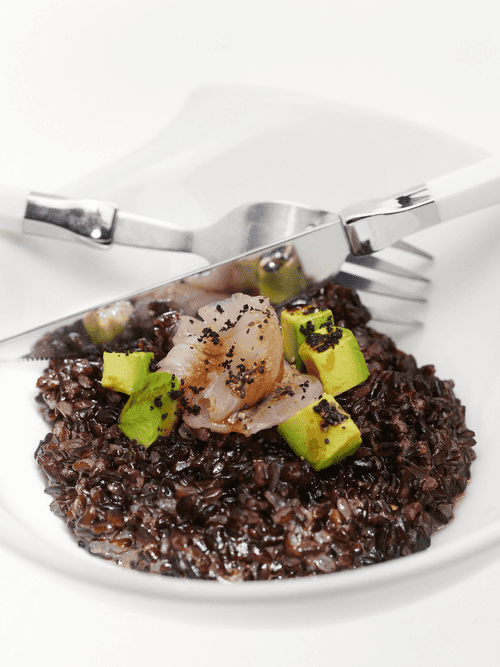 Venere rice risotto with avocado and sea bass carpaccio