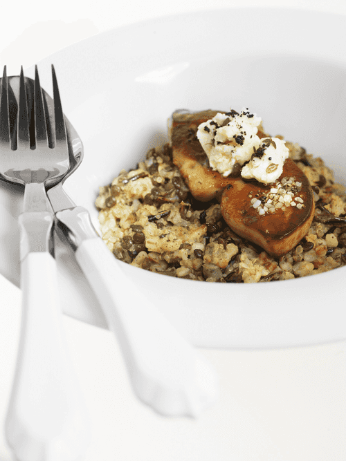 Lentil, pearl barley, buckwheat and wild rice risotto with foie gras and goat cheese