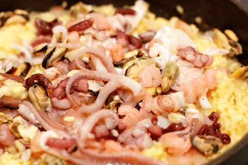 When the wine evaporates, add saffron and stir. Now add fish broth to the rice one ladle at a time (about 200 ml). When the first ladle of broth is almost completely evaporated, add the second, then the third, and so on until the broth is finished.