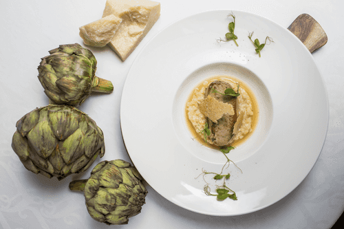 Serve the celery risotto on a plate, topped with foie gras. Garnish with parmesan chips and micro salad leaves. Add duck broth separately.