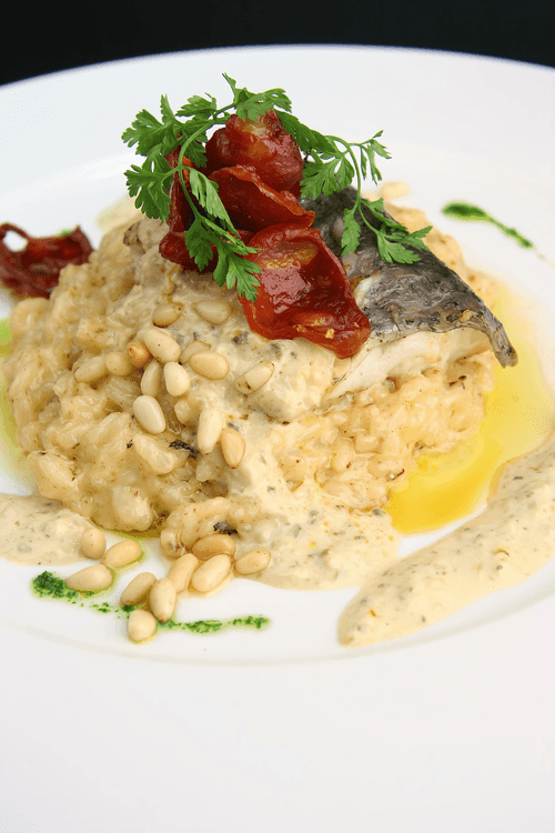 On the plate, we place the risotto, topped with pan-fried barramundi fillet, chorizo, sprinkled with pine nuts and drizzled with Chardonnay mousse.