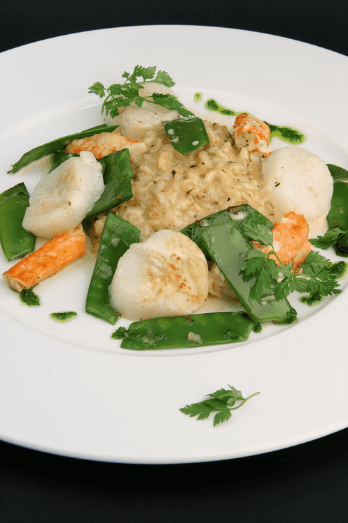 Risotto with sherry sauce, scallop, crab meat and sweet green peas