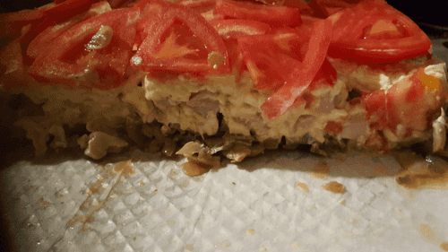 We assemble the salad: in a detachable mold (I have a diameter of 25 cm), we lay out fried mushrooms with onions, spreading them across the mold. On top, we carefully place half of our egg-cheese mixture and cover the first layer.