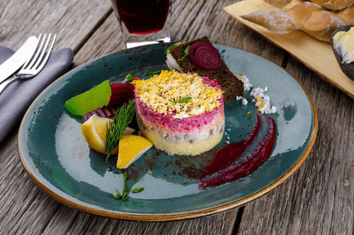 Herring under a fur coat with green apples is an original interpretation of the classic Soviet salad that has become an integral part of the festive table. It combines traditional layers of potatoes, carrots, and beets with the unexpected freshness of green apple, giving the dish a light tang and pleasant juiciness. Lightly salted herring in harmony with the softness of vegetables and tenderness of eggs creates a rich flavor highlighted by a hint of black pepper spice. This salad not only pleases the eye with its bright layers but also boasts a magnificent texture – from the density of potatoes to the airiness of grated egg whites and yolks. Herring under a fur coat with green apples is a successful blend of tradition and innovation, making it special at any feast.