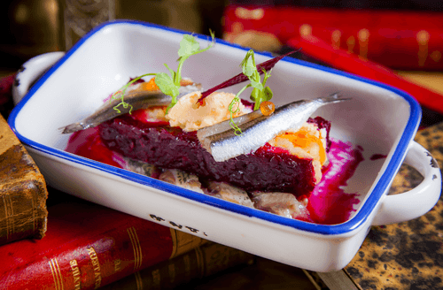 It's best to take barrel herring, of regular salting. It's not a problem if it's heavily salted. No need to soak it. We'll play on the contrast of salty fish and fresh vegetables. Boil the potatoes 'in their jackets'. Wrap the beetroot and carrots in foil and bake in the oven until fully cooked.