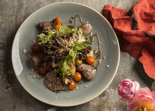 Warm beef salad is a true embodiment of Italian gastronomy, combining rich flavors with the art of simple yet refined cuisine. Marinated pieces of ribeye beef infused with thyme, mustard, and Worcestershire sauce acquire a rich taste that perfectly complements the tenderness of mini potatoes and the freshness of vegetables. The salad mix adds lightness while the classic vinaigrette provides a tangy note. This salad is a versatile dish that can be served as a warm appetizer or light dinner. It pairs wonderfully with crispy bread and a glass of dry red wine, making the meal particularly enjoyable. Its rich yet balanced flavor makes it an ideal choice for lovers of Italian cuisine.