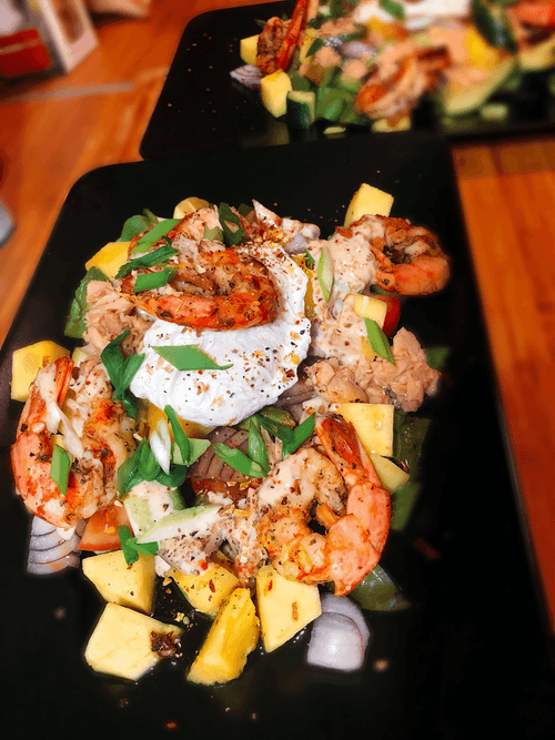 Салат с креветками и тунцом – это яркое и сочное блюдо, вдохновленное богатством паназиатской кухни. В нем гармонично сочетаются свежесть овощей, экзотическая сладость манго, сливочность авокадо и пикантность красного лука. Нежные лангустины, обжаренные с ароматными специями, придают салату морской акцент, а тунец добавляет насыщенности. Заправка на основе оливкового масла, бальзамического уксуса, соевого и орехового соуса подчеркивает многогранность вкуса. Завершающим штрихом становятся яйца пашот, добавляющие нежность и структуру. Этот салат идеально подходит для легкого ужина или как изысканная закуска, позволяя насладиться утонченным балансом вкусов и текстур.