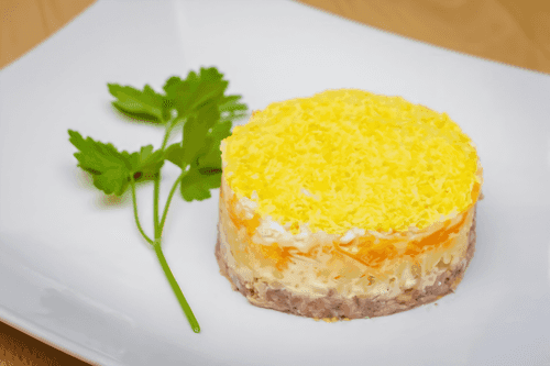 The 'Mimosa' salad is a true symbol of cozy home gatherings. This recipe originated in Russia and got its name due to its layered structure resembling delicate yellow mimosa flowers. The dish's flavor is multifaceted: tender sardines provide a marine depth, eggs and butter add velvety softness, while onions and carrots contribute a light sweetness and spiciness. Mayonnaise binds the layers together, making them harmonious and juicy. This salad is perfect for festive tables, especially in winter when one craves something nourishing and warming. It can serve as a standalone dish or accompany other traditional snacks. It's easy to prepare, and the result is always magnificent. Try creating this culinary masterpiece; it will surely adorn any celebration!