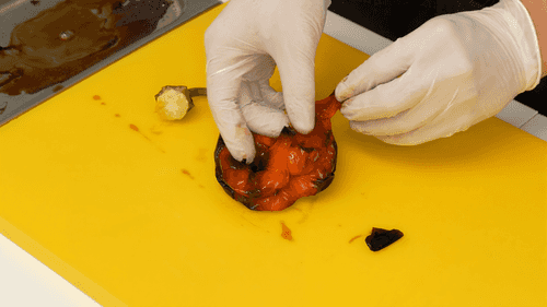 Roast the sweet pepper in the oven until the sides are blackened, then peel and chop coarsely.