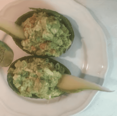 Cut the avocado in half, remove the pit. Carefully scoop out the flesh while keeping the skin intact. Dice the flesh into small pieces.