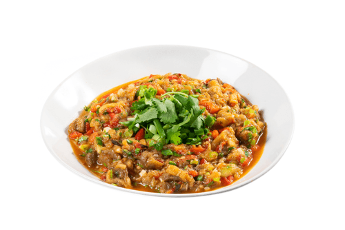 Peel the eggplants, zucchini, tomatoes, and sweet peppers, chop them into small cubes and mix. Mince the garlic, chop the green onion and cilantro, mix with the roasted vegetables, dress with olive oil and tomato paste, season with salt and pepper to taste.