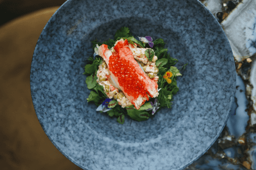 Use a ring to arrange the Olivier on a plate, placing a hot poached egg in the center. Scatter a mix of microgreens around the Olivier. On top of the Olivier with the egg, place crab warmed in butter. Add caviar on top of the crab.