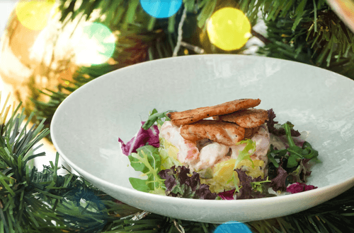 Place the salad on a plate using a culinary ring. Top with shrimp in mayonnaise, followed by chicken fillet. Garnish with a mix of salad leaves.