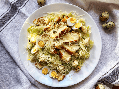Caesar salad is a true symbol of American cuisine, created in 1924 by Italian restaurateur Caesar Cardini in Tijuana, Mexico. This salad combines crispy iceberg lettuce, juicy chicken fillet, tangy capers, and tender quail eggs for a harmonious flavor. The key feature is the homemade dressing made from olive oil, lemon juice, Dijon mustard, and Parmesan cheese that gives it a creamy texture and slight spiciness. Toasted baguette cubes add an appetizing crunch to each forkful. Caesar is perfect for both a light dinner and festive gatherings, remaining one of the most popular salads in the world.