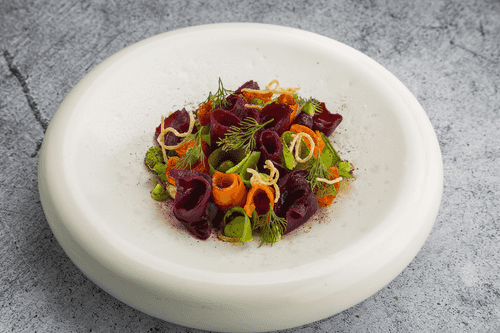 Place the vinaigrette on a plate, generously drizzle with honey-mustard dressing, and garnish with beet leaves, dill sprigs, and finely chopped green onions.