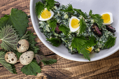 Garnish with halved quail eggs, fresh nettle leaves, and blackberries.