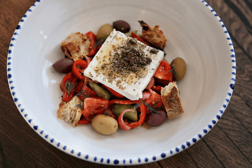 Place the vegetables, croutons, olives, onion, dill, and oregano in a deep dish.