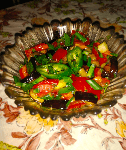 Prepare the salad. Layer eggplant, cucumber, tomato, green onion, cilantro, and hot pepper in a bowl; add crushed garlic, sugar, spices, vinegar and dress with 1 tablespoon of soy sauce. Mix well and serve.