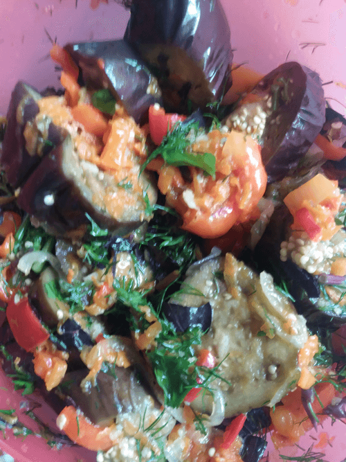 Combine the cooled eggplants and sautéed vegetables in a deep dish. Mix vinegar, sugar, and salt, pour over the vegetables, and add the remaining vegetable oil.