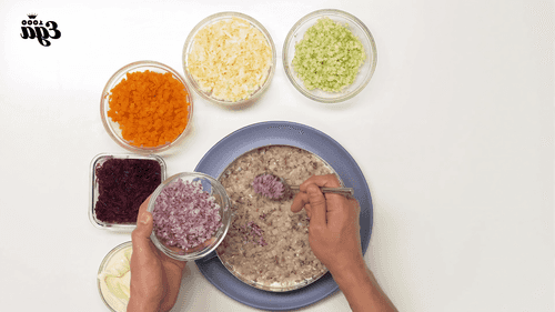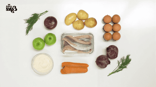 Layer the salad on a plate, spreading each layer with mayonnaise. The recommended order of ingredients is: potatoes, herring, onions, apples, eggs, carrots, beets.