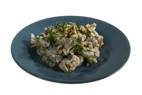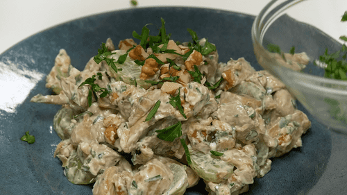 Mix the prepared onions and mushrooms with grapes and walnuts, add chopped parsley, and dress with mayonnaise. Set aside some nuts and parsley for garnish.