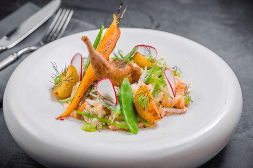 Garnish with thin slices of radish and carrot, lettuce leaves, and black caviar. Place a quail leg in the center of the dish.