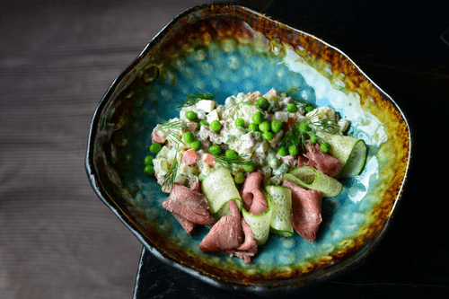 Cut the roast beef into 1x1 cm cubes. Dice the boiled potatoes and eggs, as well as fresh and pickled cucumbers into small cubes.