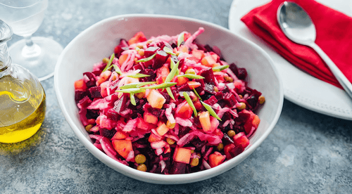 Vinaigrette with green peas and pickled cucumbers is a classic Russian dish loved for its freshness and rich flavor. Its history dates back to the 19th century when Russian cuisine was enriched with vegetable salads. In this version, the sweetness of beets harmonizes with the tenderness of green peas and the slight sourness of pickled cucumbers and cabbage. Lemon juice adds a light freshness, while vegetable oil brings all the ingredients together into a unified flavor composition. This salad is perfect as a standalone dish or a side to meat. Served chilled, it is especially refreshing. Vinaigrette is not just food but part of Russian gastronomic culture that combines traditions and modern taste preferences.