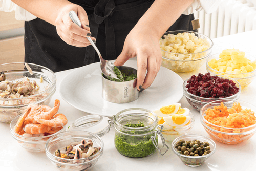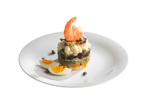 Assemble the layers of the salad. The base is galettes soaked in water and vinegar. Arrange the ingredients in order based on your taste, alternating with green sauce. Once the layers are finished, top with green sauce and seafood. Then leave in the refrigerator until ready to serve (at least 12 hours).