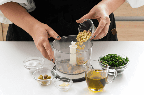 A day before preparing cappon magro, prepare the green sauce to keep it in the fridge for 24 hours. To do this, chop a garlic clove and mix it with a pinch of coarse salt, a handful of pine nuts, anchovies, and 5 olives in a mortar or blender. Then add chopped parsley. Blend all ingredients together while adding extra virgin oil to achieve a smooth and creamy mixture. Finally, add lemon juice and season with salt and pepper to taste.