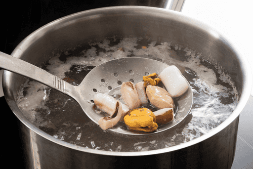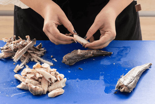 Boil the fish in salted boiling water, drain the water, and clean the fish. Then season it with oil, salt, and a little lemon juice and set aside.