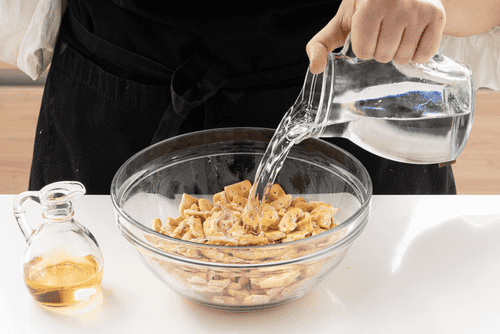Soak the plain crackers in water with a teaspoon of white wine vinegar for 10 minutes. After 10 minutes, gently mash them with a fork and drain the liquid.