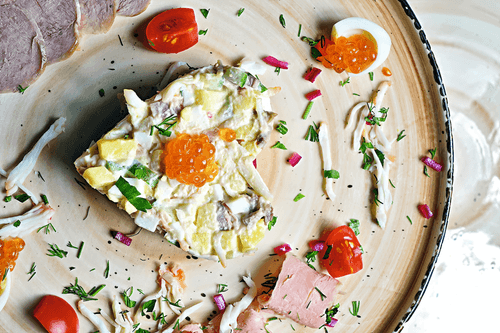 To serve the salad, place it on a plate using a serving ring and garnish with quail egg, red caviar, sweet pepper, and greens.