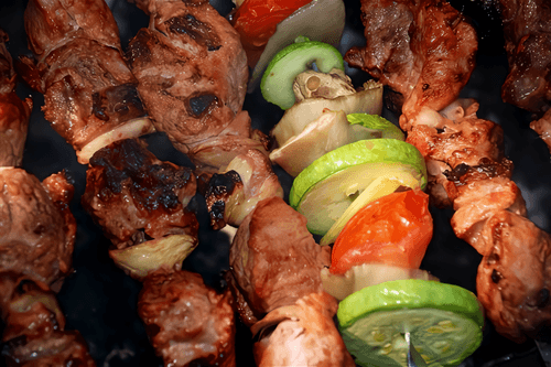 The salad is a complement to the shashlik. It is recommended to start preparing it while waiting for the coals for the shashlik. A grill should be placed on the barbecue — in its absence, vegetables can be skewered.