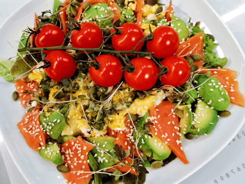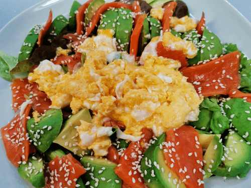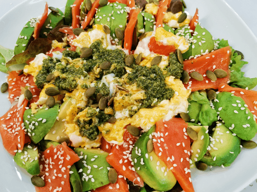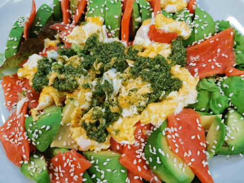 Salad with chinook salmon, avocado, and pesto sauce is a harmony of exquisite flavors and healthy ingredients. Inspired by author cuisine, it combines the tenderness of chinook salmon, the creamy texture of avocado, and aromatic pesto sauce to create an incredible gastronomic experience. The lightness of greens, the acidity of lemon juice, and crunchy sesame and pumpkin seeds make the dish multifaceted and balanced. Scrambled eggs add richness while cherry tomatoes provide freshness. This salad will not only delight gourmets but also beautify any table, suitable for both a light dinner and a festive feast.