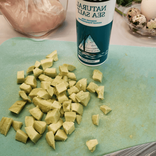Peel the avocado, cut it into cubes, and add salt.