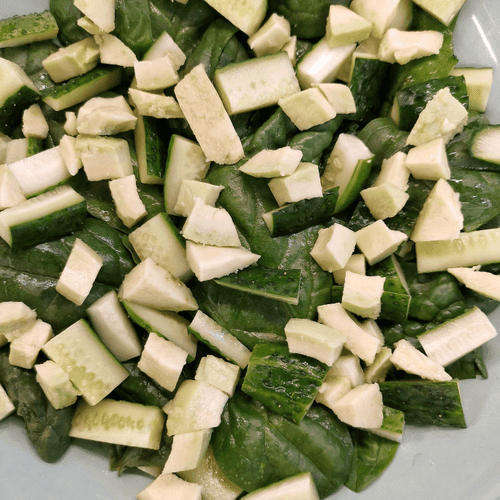 Place cucumbers with avocado on the spinach.