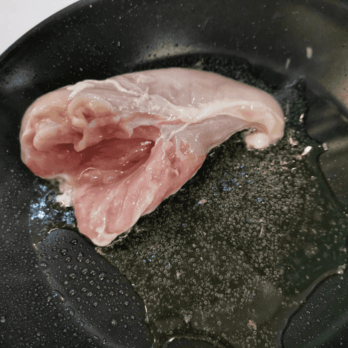 Place the chicken meat in the frying pan.