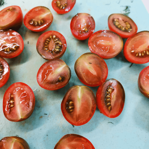 Cut the tomatoes in half.