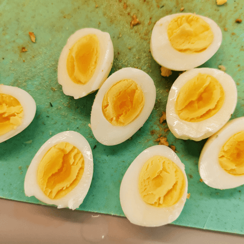 Cut the eggs in half.