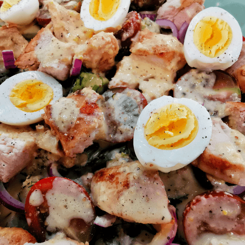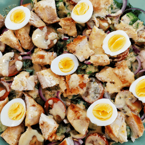 Salad with chicken and quail eggs in sauce
