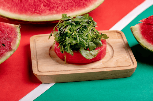SOS. Café chef Mikhail Gorbunov offers a simple yet elegant recipe for watermelon salad: a portioned disc is cut out of the watermelon pulp, a plume of arugula is placed on top of it and it is dressed with lemon and balsamic cream . The bitterness of arugula and the piercing sweetness of watermelon, the tartness of balsamic and citric acid - all the ingredients precisely maintain balance and sing along with each other.