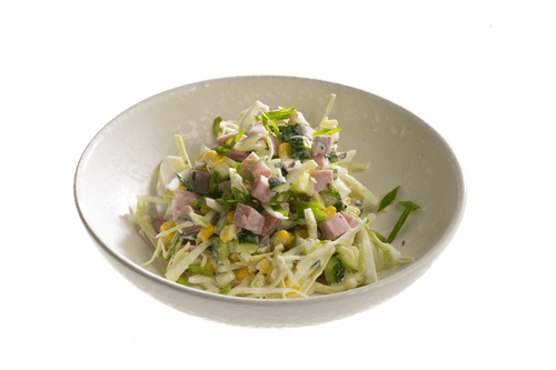 This ham salad is a simple dish that can be prepared in 5 minutes if you have a simple set of products at home. Ham is responsible for the protein base and meaty spirit, cucumbers are for freshness and lightness, and canned corn is the very ballast that will allow us to eat our fill. Please note: corn can be simply sweet, can be sweeter than usual, or can be of very modest merit. The recipe allows you to choose any, depending on your taste preferences .